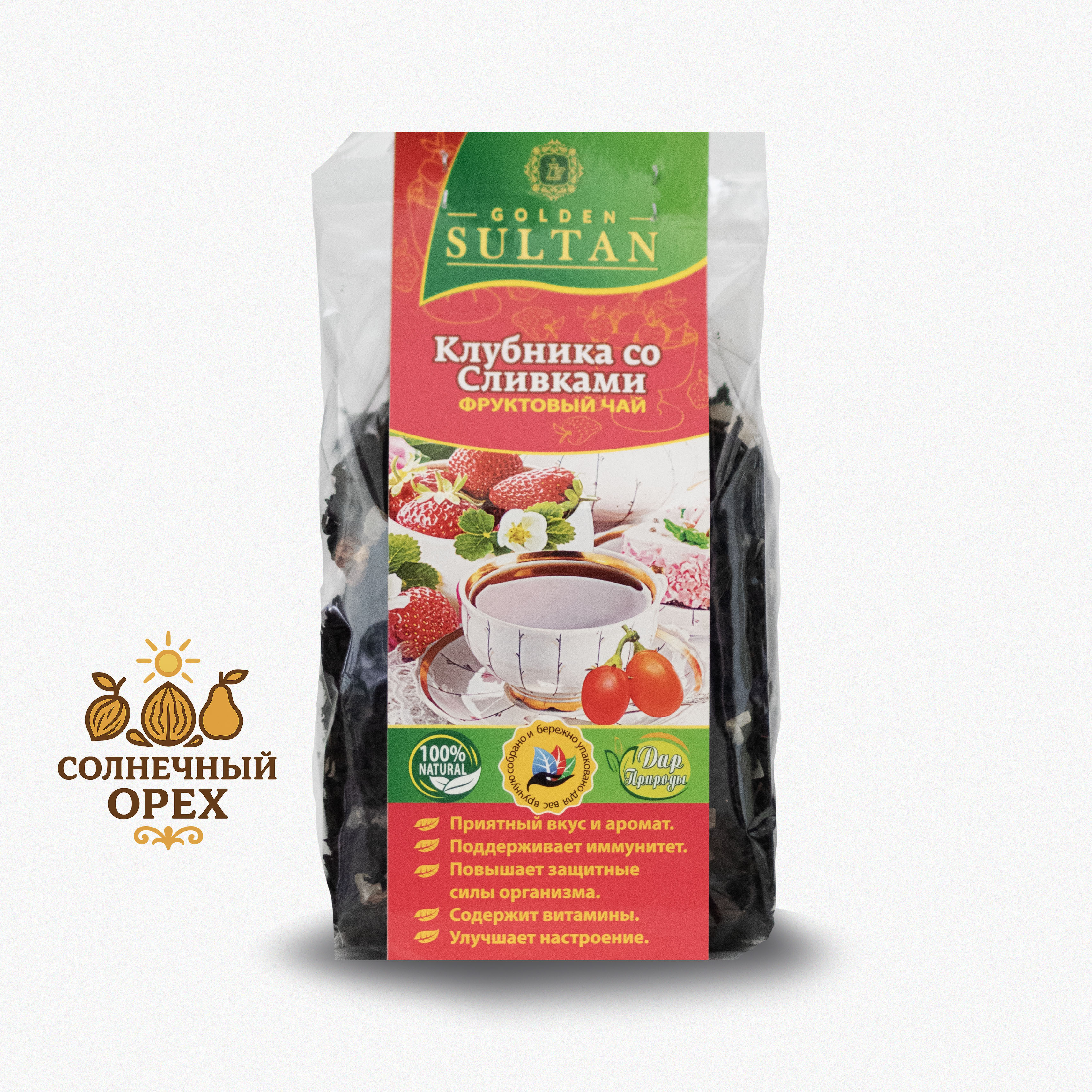 Чай "Golden Sultan Клубника со сливками" — изысканный напиток премиум-класса, созданный из отборного чайного листа с добавлением натуральных кусочков клубники и ароматных сливок. Каждый глоток дарит насыщенный вкус свежих ягод и нежное послевкусие кремовых сливок. Идеален как повседневный напиток и прекрасный выбор для особых случаев. Приятный бонус – способствует расслаблению, улучшению настроения и восстановлению сил после трудового дня.