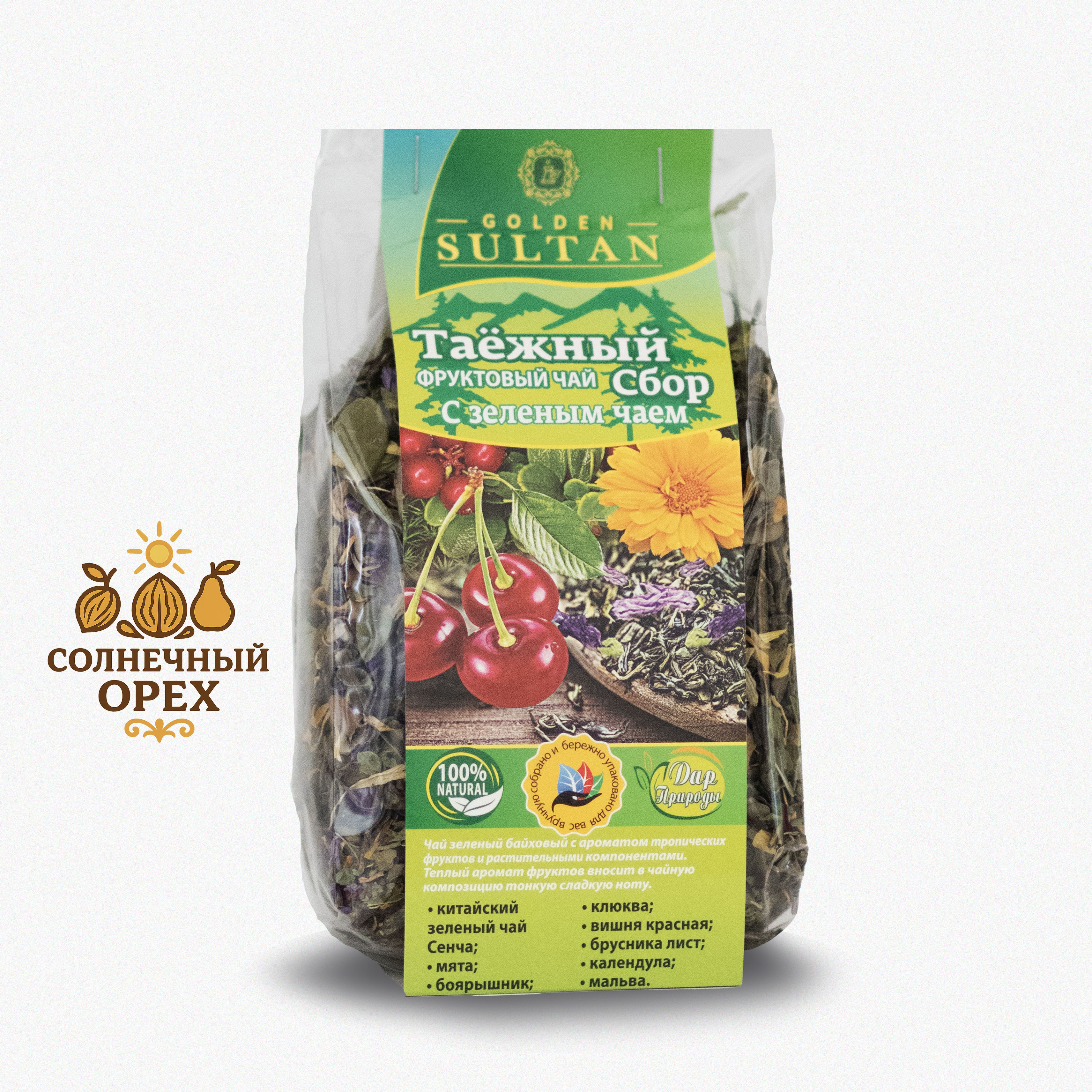 Чай "Golden Sultan Таежный сбор с зелёным чаем" — изысканный напиток из отборных таёжных трав и высококачественного зелёного чая. Природная энергия сибирской тайги в каждой чашке! Поддерживает иммунитет, способствует улучшению общего самочувствия и настроения. Идеален как повседневный чай и подарок ценителям натуральных продуктов. Удобная упаковка сохраняет свежесть и аромат. Наслаждайтесь вкусом природы вместе с чаем "Golden Sultan"!